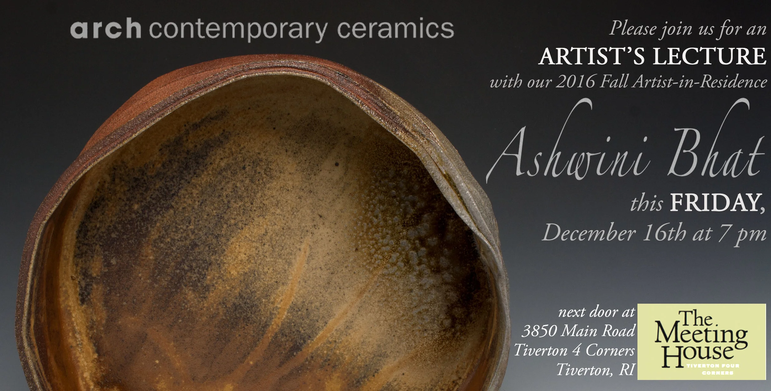 Fall resident and internationally-recognized ceramic sculptor Ashwini Bhat will present a lecture on her work and life as an artist. Please join us at the Meeting House at 7 pm and stick around as the rest of the shops and galleries stay open late for holiday shopping.